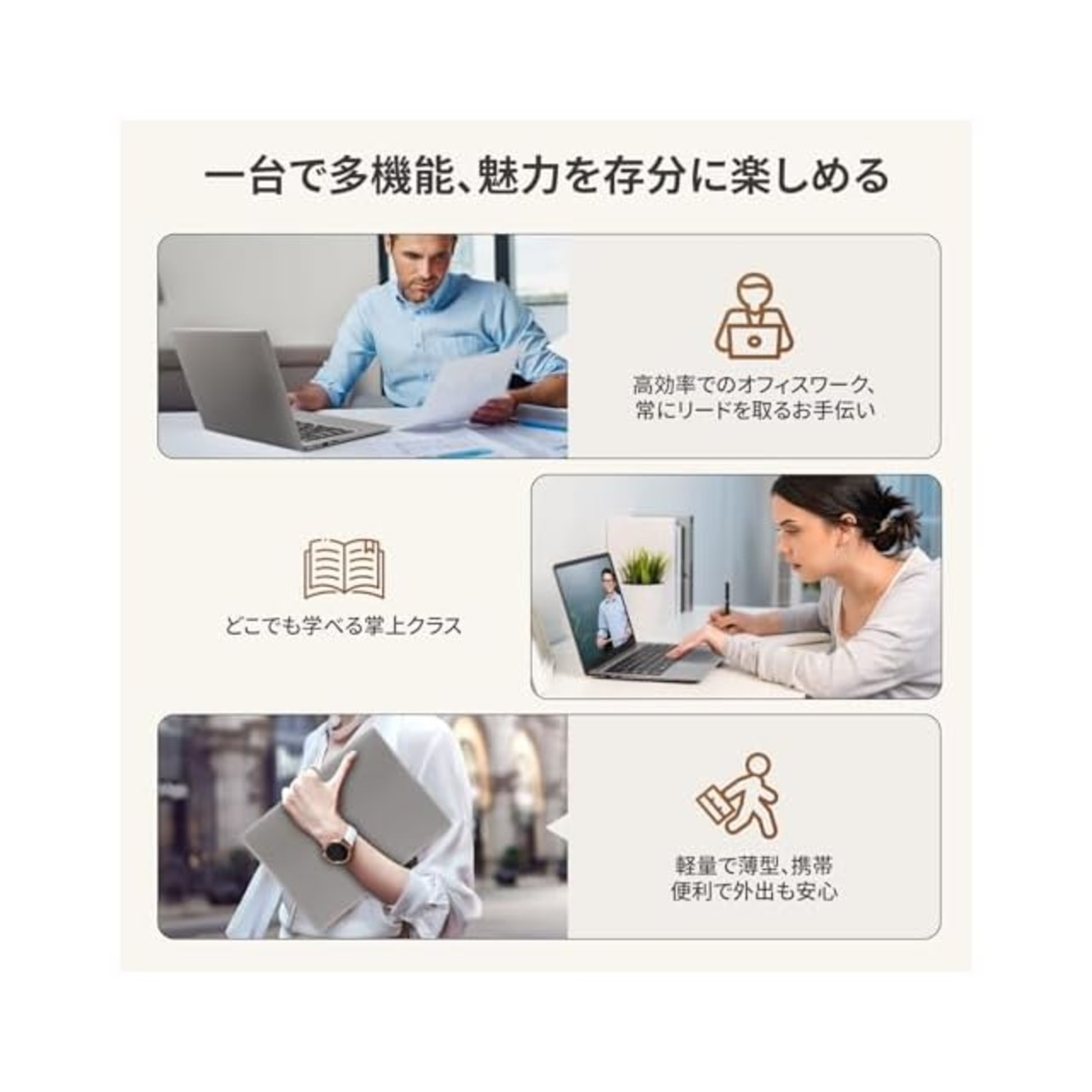 【軽くて薄くて超薄型】薄くスタイリッシュなボディ、重量約1.25Kg、最薄9mmの設計で大手ブランドに匹敵する製品であり、持ち運びに非常に便利!小さなカバンやハンドバッグにも収納できる超薄型軽量のため、ビジネスやプライベートの外出先での使用など、頻繁に持ち運ぶ場合にもおすすめです。