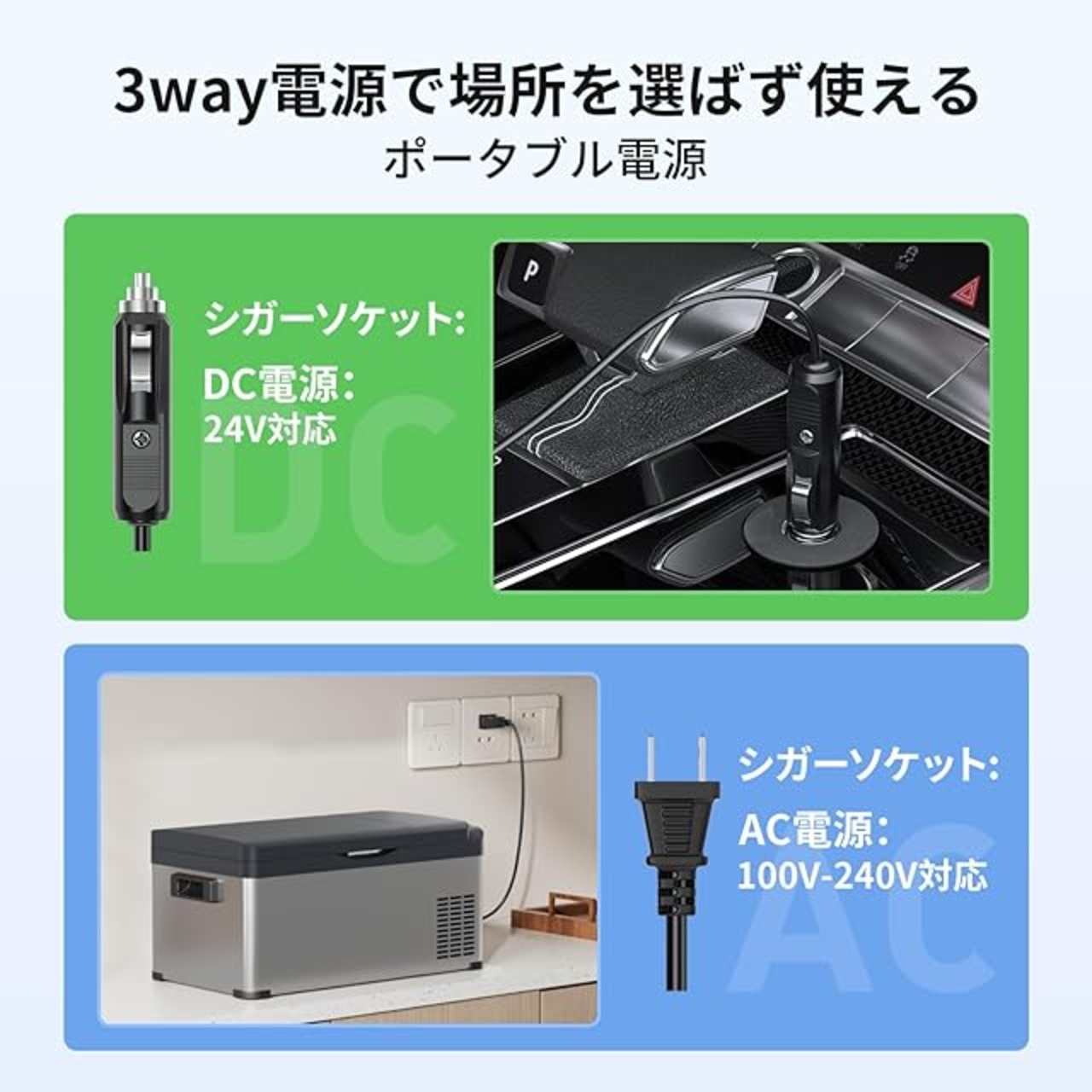 【家庭/車載2Way電源】マルチ電圧対応冷凍冷蔵庫|低電圧保護搭載 車載はDC12V/24Vで軽自動車〜トラックまで幅広く対応、ドライブ旅行を快適にサポート。家庭用AC100-240Vコンセント接続可能で、車中泊・業務用・家庭冷蔵庫として自由に活用可能。H3/H2/H1三段階調節による低電圧保護機能で、バッテリー電圧不足時にコンプレッサー自動停止?バッテリー上がりゼロの安心稼働を実現。
