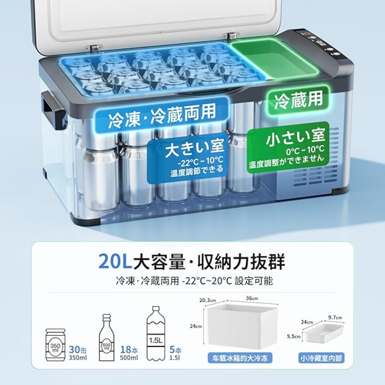 【20L大容量|コンパクト設計】車載冷蔵庫|350ml缶30本収納・防災対応 小型車載冷蔵庫ながら20Lの大容量を実現。350ml缶30本/500mlペットボトル15本/1.5Lボトル5本を収納可能な主室(内寸約36×24×20.3cm)に加え、小物用補助室(内寸約24×9.7×5.5cm)を完備。軽自動車の狭い空間にも設置可能な超薄型ボディで、ドライブはもちろん、台風・災害時の緊急冷蔵庫としても活躍します。