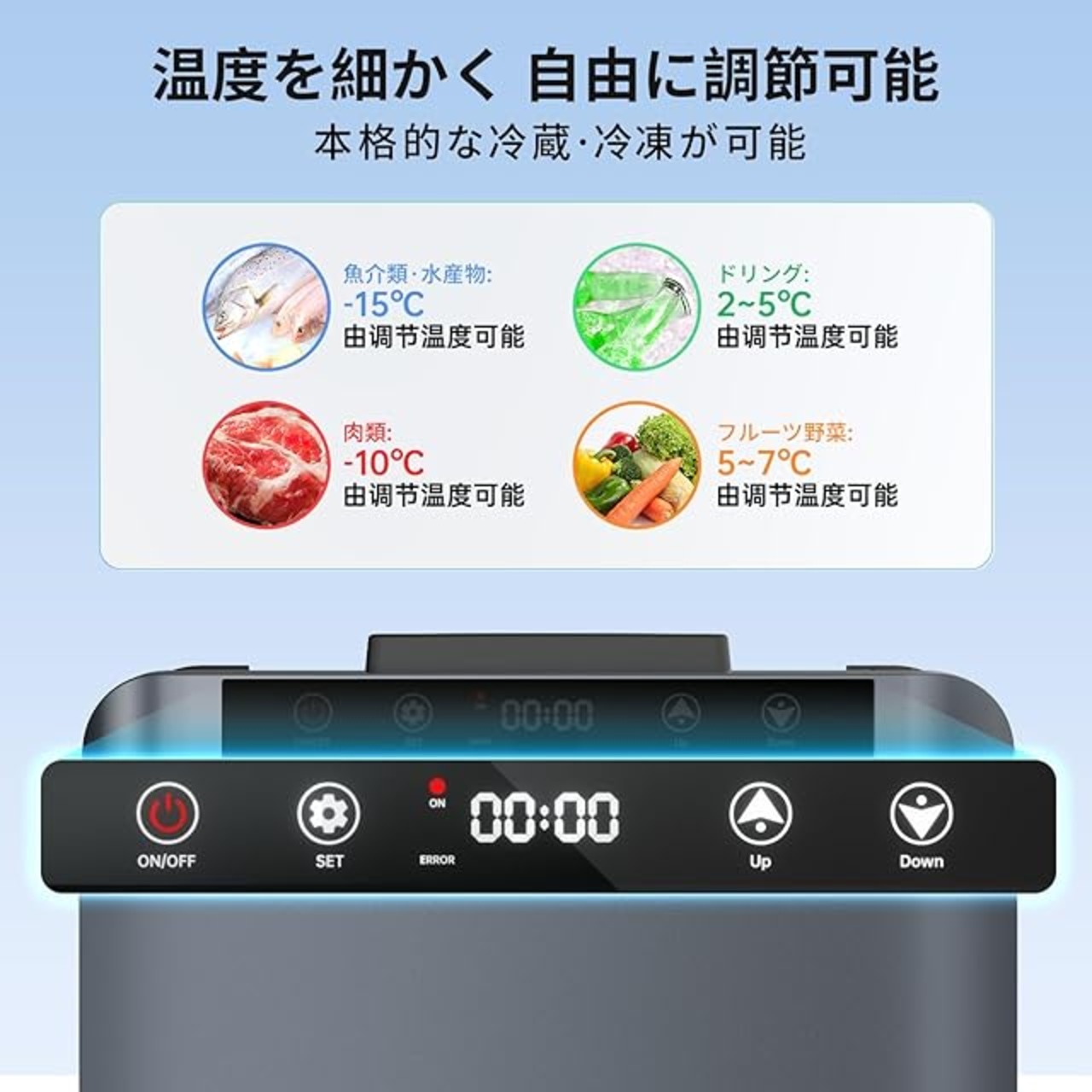 【プロ級急速冷凍】コンプレッサー式ポータブル冷凍庫|40分で常温→-22℃達成 家庭用冷蔵庫と同等のコンプレッサー冷凍機構を搭載。-22℃〜10℃の広域温度調節が可能で、たった40分で常温25℃→-22℃急速冷却(空運転実測)。冷気漏れを防止する磁気吸着フタと、四面内壁に充填した高密度ポリウレタン断熱材で、電源OFF後も数時間の保冷持続を実現。車載はもちろんキャンプやアウトドアシーンで活躍する本格派冷凍庫です。