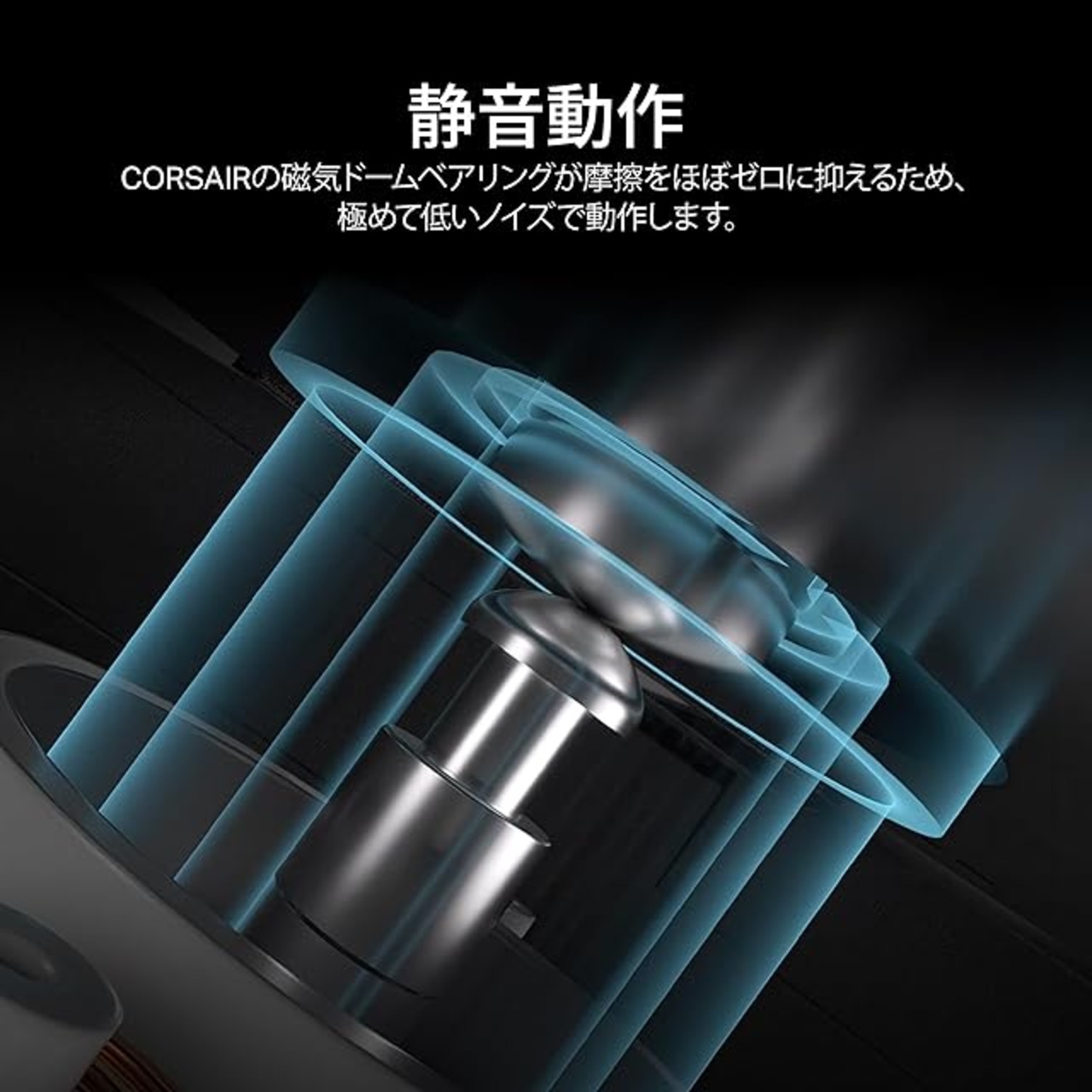 液晶ポリマー製のファンブレードをグラスファイバーで補強し、強く耐久性の高い構造を採用しています。加えてマグネティックドームベアリングが摩擦を抑えて静音性を、CORSAIR AirGuideテクノロジーが風を集中させて冷却性能を高めています。