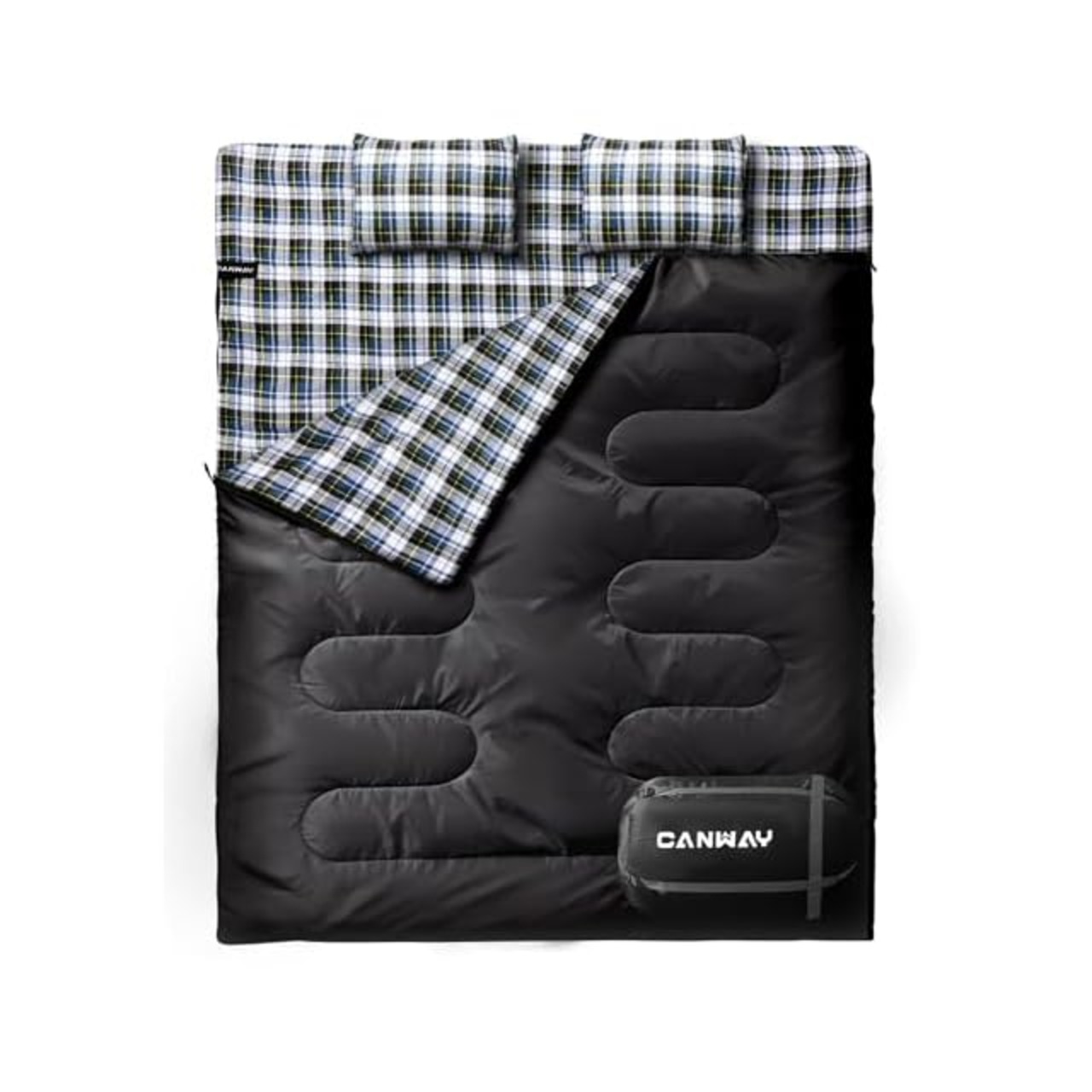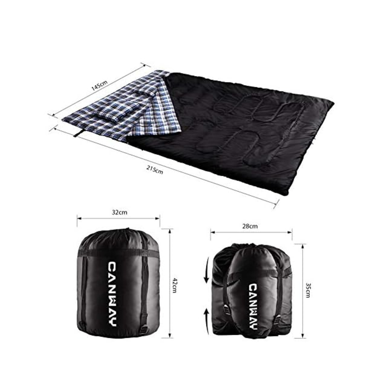 CANWAY 寝袋 2人用 防水シュラフ スリーピングバッグ 封筒型 キャンプ 連結解体可能 枕2つ・収納パック付 フランネル ブラック