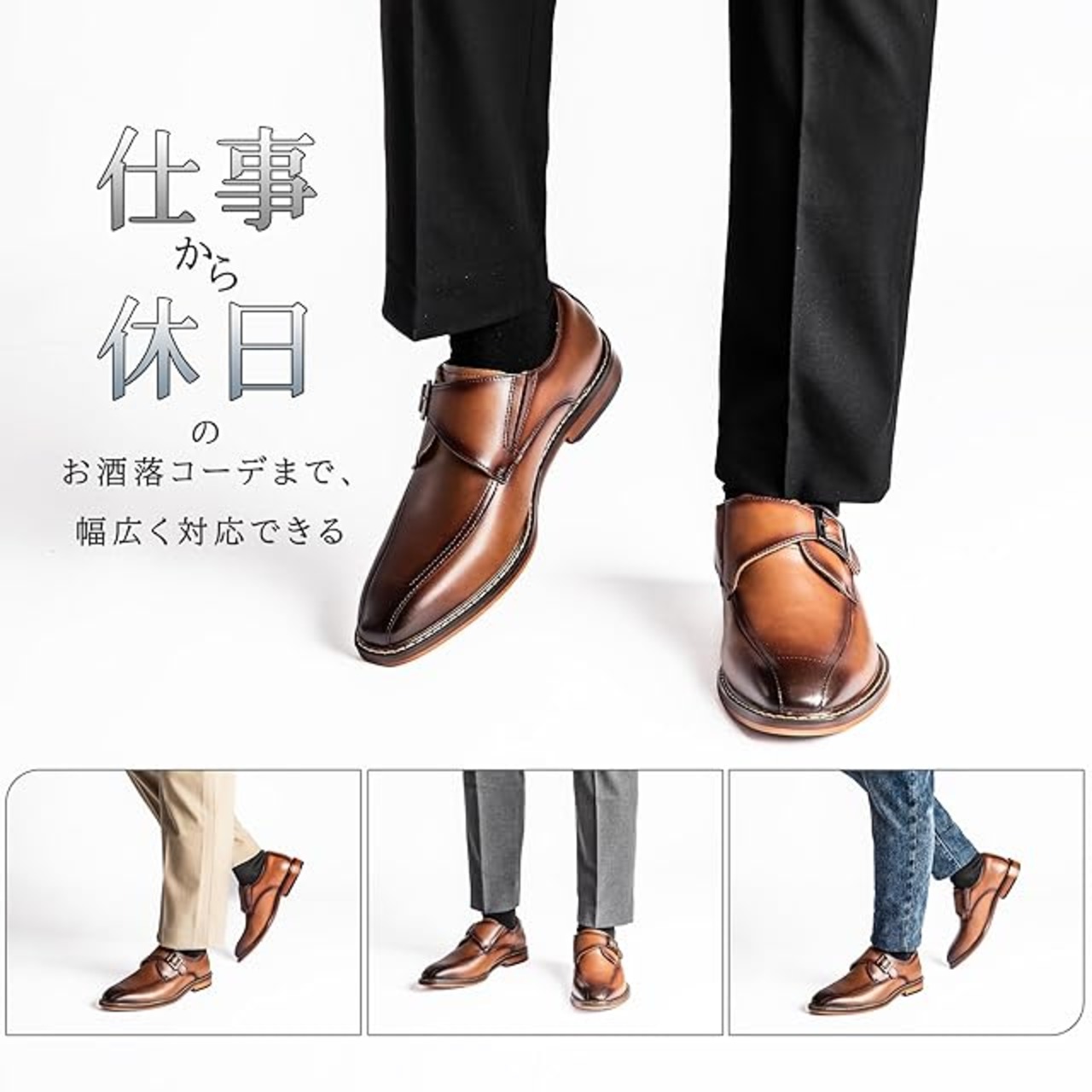 モンクストラップのモンクストラップ部分のアクセントはおしゃれで、ダブルストラップは開けなくでも、履き脱ぎは楽チンなビジネスシューズです。★モンクストラップの特徴としては、 リーズナブルで丈夫で、デザインもまあ綺麗で、実用性が高い!