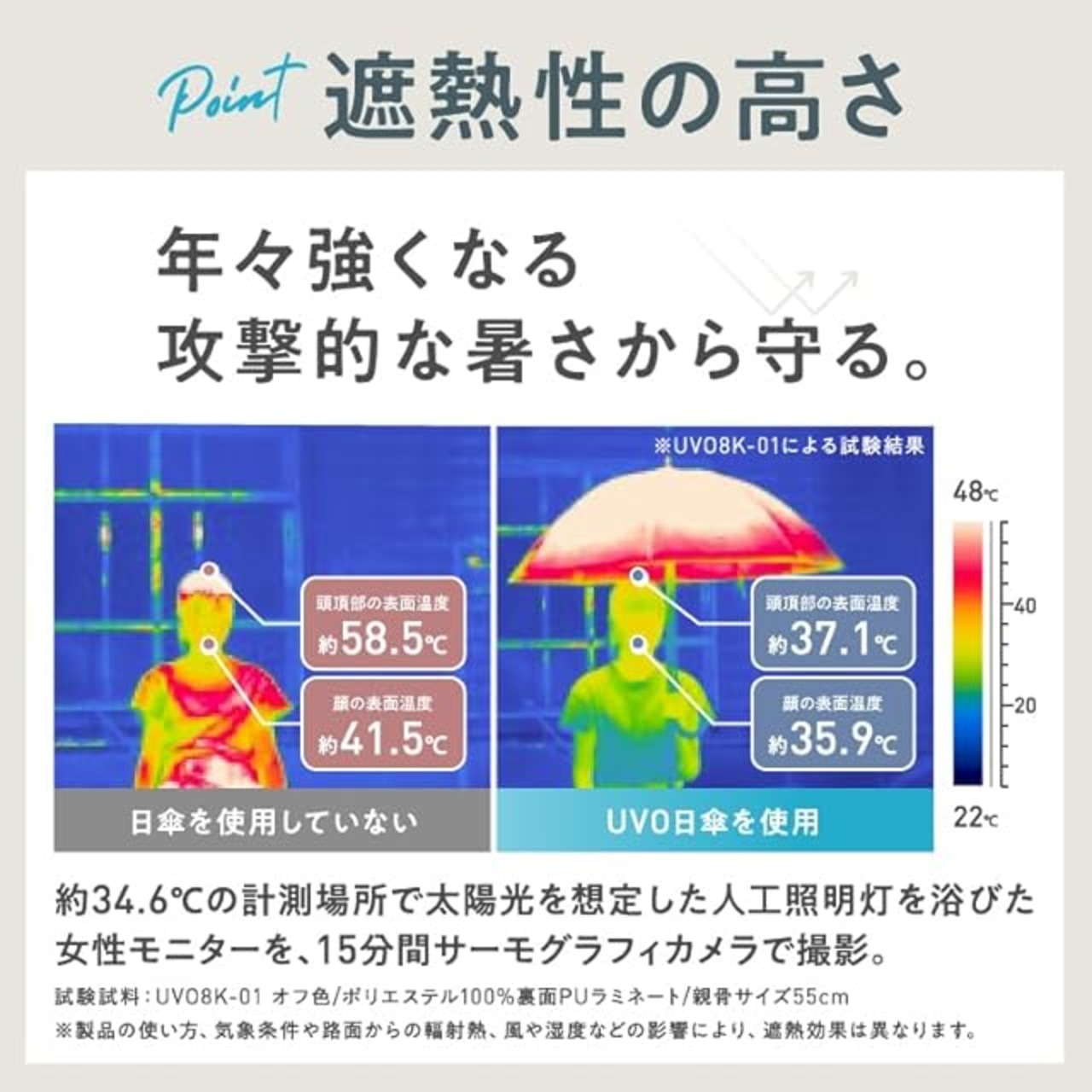 【攻撃的な暑さから体を守る、高い遮熱性】 紫外線から肌を守るだけではなく、攻撃的な暑さからカラダを守れるよう、UVOは高い遮熱性を実現しています。 暑い夏の熱中症対策にもご活用いただけます。