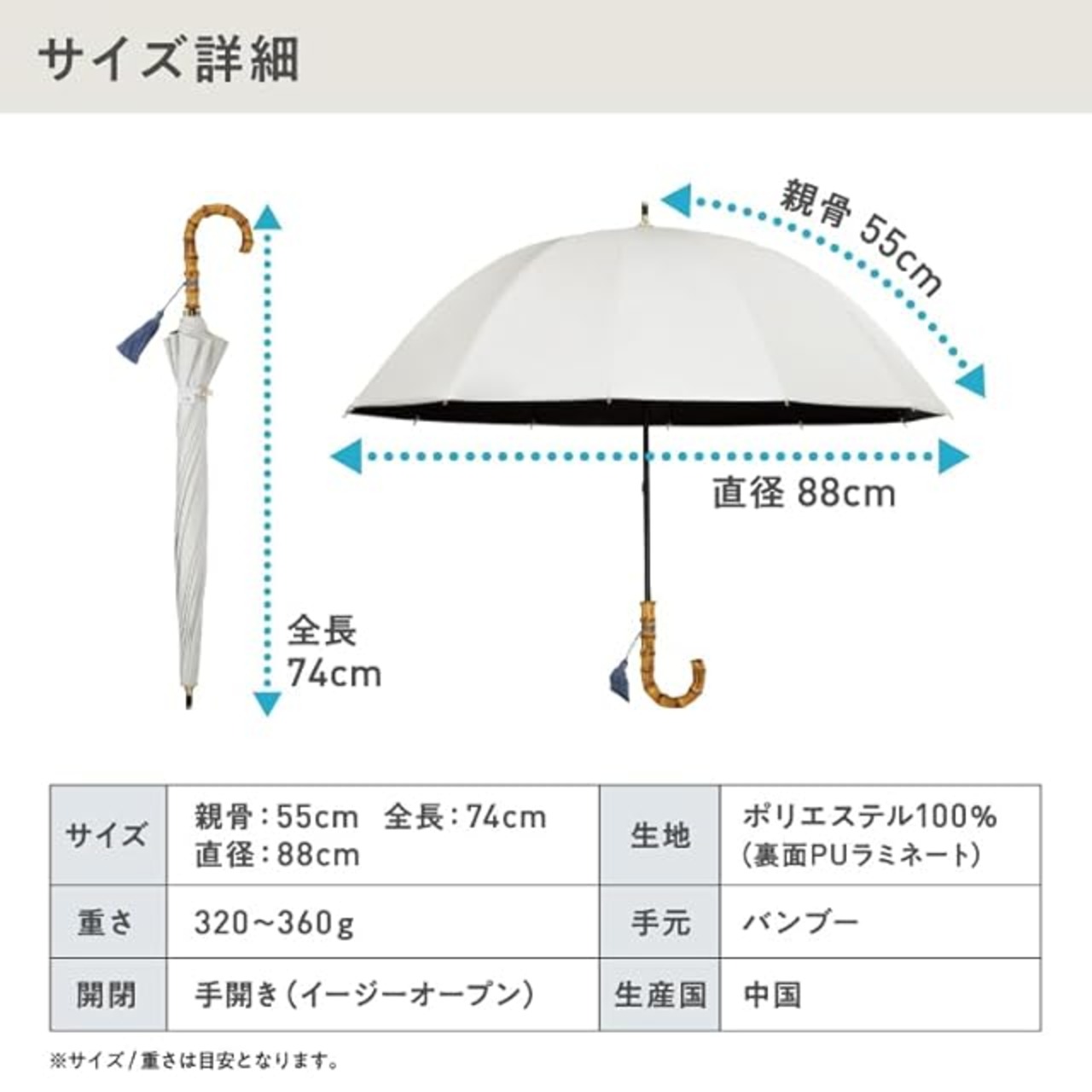 【強さも美しさも備えた12本骨】 多骨ならではの美しいシルエットが魅力の12本骨には、深張りデザインを採用。 親骨55cmと大きめサイズで、しっかりと日差しをカバーしてくれます。 つゆ先・石突には高級感のあるゴールドパーツを使用。 耐風性能試験に合格しており、壊れにくく安心感があるのが特徴です。