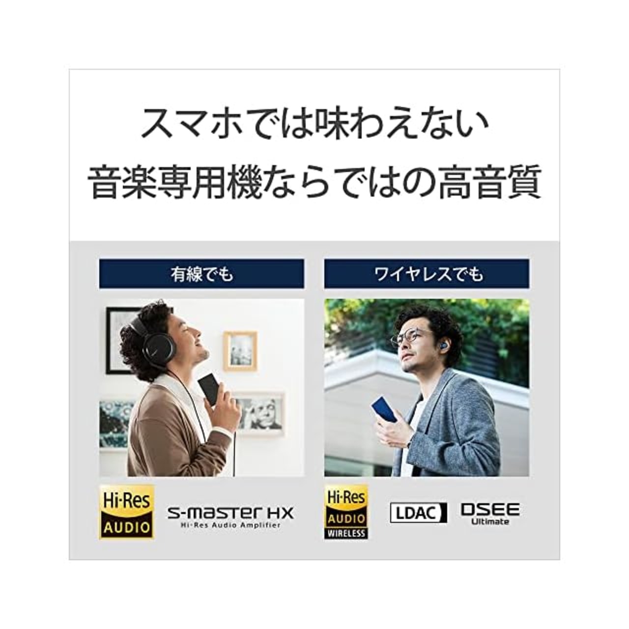 あらゆる音源を有線でも、ワイヤレスでも、高音質で楽しめる CD音源やダウンロード購入した楽曲、ストリーミングサービスで配信されている楽曲などあらゆる音源を「音楽専用機」ならではの高音質で再生。ウォークマンが長年培ってきたフルデジタルアンプの技術を結集した「S-Master HX」やこだわりの厳選パーツなど、コンパクトサイズながらスマートフォンにはない高音質に特化した本体設計を追求。また、有線接続時/ワイヤレス接続時にかかわらずAIが楽曲のタイプを解析し自動的に最適なアップスケーリングをする「DSEE Ultimate」により、普段スマートフォンで聴いていた音楽もハイレゾ級高音質で楽しむことができます。