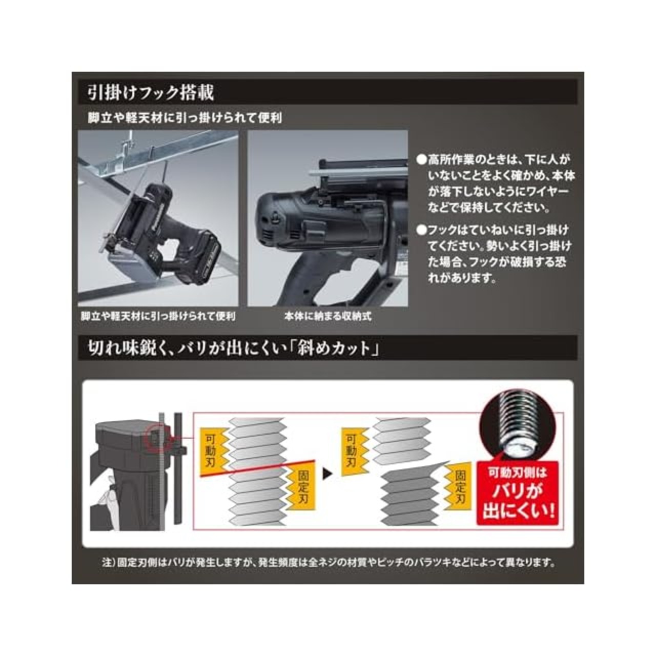 切断能力:W3/8全ネジ(軟鋼・ステンレス)、M10全ネジ(軟鋼のみ・別売純正刃にて対応)