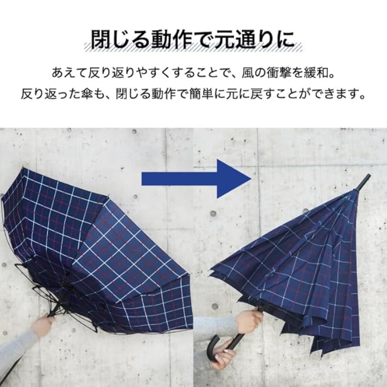【特殊な骨の構造で耐風25m/sを実現】 風の抵抗により、最も折れやすい親骨と受け骨のジョイント部分にZ型のパーツを使用。 強風を受けたときにあてて反り返る仕様で、風の衝撃を逃します。 骨の材質はしなって折れにくいグラスファイバーを使用し、耐久性にも優れています。
