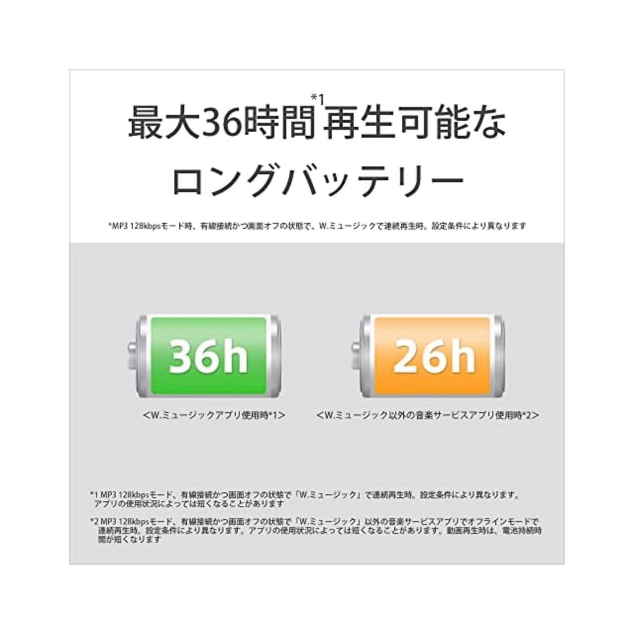最大約36時間再生可能なロングバッテリー ストリーミングサービス利用時のバッテリー持続時間も向上。新規プラットフォーム採用により、省電力化を実現し、特に待機時の消費電力や、音楽ストリーミングサービス使用時等の電力消費量を大きく削減しています。また、上位機種と同様のバッテリーを採用し、ロングスタミナを実現しました。さらに、microSDメモリーカード対応で、万が一本体容量が足りなくなってしまった場合でも、メモリーの拡張ができ、好きな楽曲をたっぷり入れられます。音楽再生は音楽専用機のウォークマン(R)に任せれば、スマートフォンのバッテリー消費や容量を気にすることなく、好きな楽曲を快適に楽しめます。
