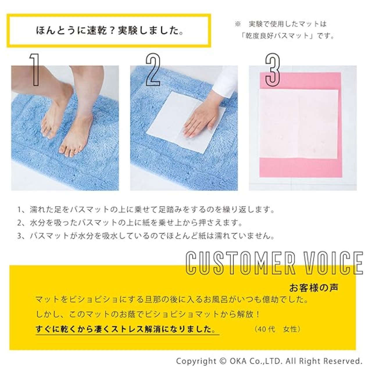 オカ株式会社が独自開発した特殊構造繊維「乾度良好(かんどりょうこう)」は25年を超えるロングセラーのバスマットです。