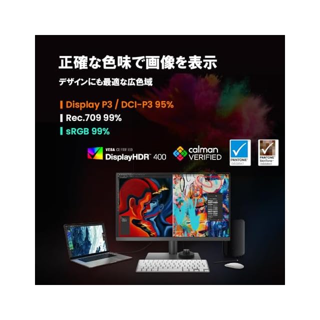 Display P3/DCI-P3 95%、sRGB/Rec.709 99%の広色域に対応し、10ビットカラーによる10億7000万色の色表現が可能。Pantone/CALMAN認証取得のAQCOLORシリーズで、出荷時キャリブレーション済(レポート同梱)。