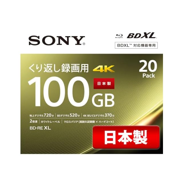 商品名:【20枚(地デジ約12時間)ドラマ・アニメまとめ保存】 ソニー(SONY) 20枚入り / ビデオ用ブルーレイディスク / くり返し録画用 / BD-RE / 1枚あたり100GB(地デジ約12時間) / 1-2倍速 / ディスク用ケース付属 / 20BNE3VEPS2
