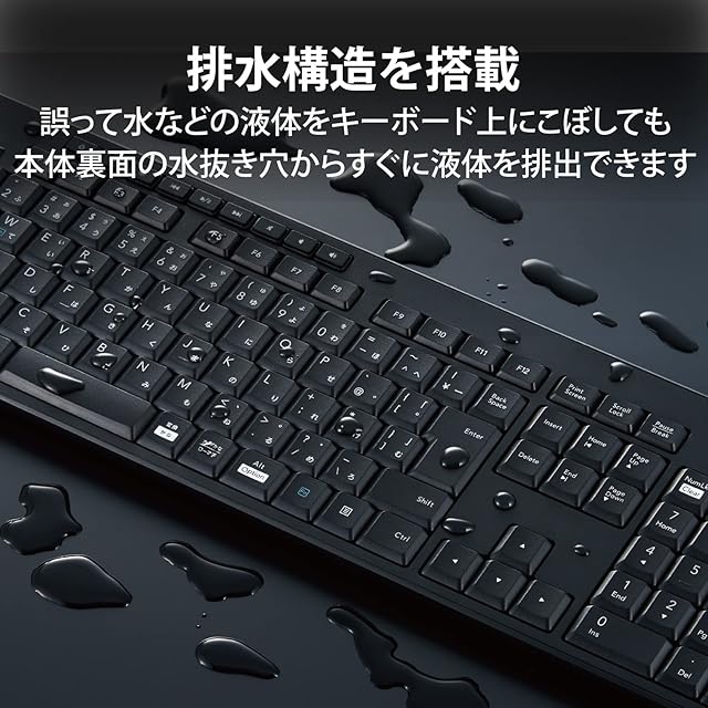 誤って水などの液体をキーボード上にこぼしても、本体裏面の水抜き穴からすぐに液体を排出できる排水機構を搭載しています。(防水設計ではありません)