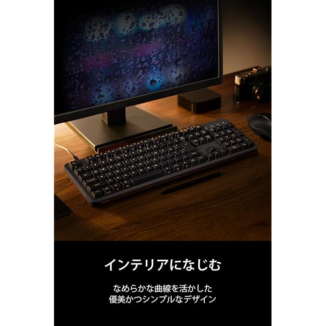なめらかでソフトな感触と打鍵音の響きにくさを両立した赤軸(リニア)を搭載し、軽やかで心地よいキータッチを実現します。