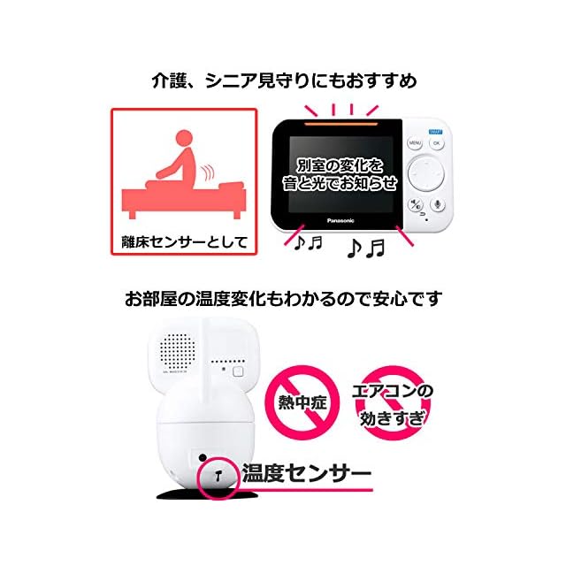 モニター機の光と音で赤ちゃんの様子をお知らせします。 使用可能距離:約100 m(見通し距離) 撮像素子:CMOS 30万画素 モニター機使用時間(ワイヤレス時):約5時間(周囲温度20 ℃、満充電の状態から連続モニターした場合)※ACアダプターでも使用可能 モニター機充電時間:約8時間(周囲温度20 ℃、待機状態で充電を行った場合)