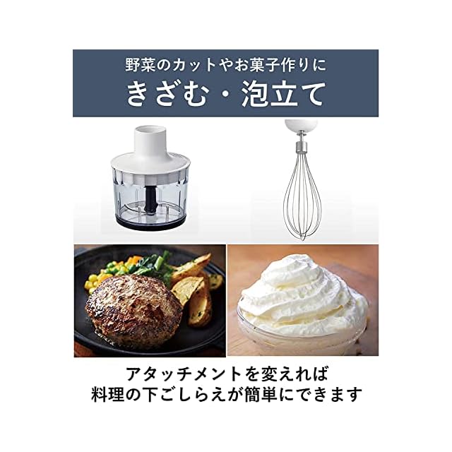 みじん切りから泡立てまで簡単に「チョッパー」「泡だて器」アタッチメント付き。