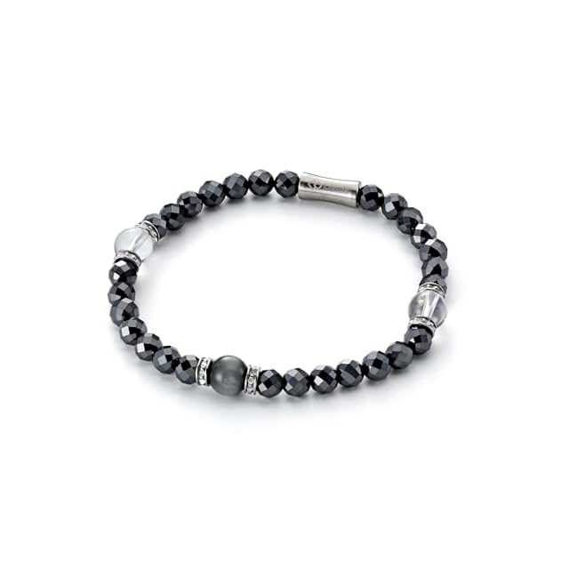 コラントッテロゴをあしらった円柱状のステンレスパーツに、ロンデル・天然石・磁石を組み合わせたループです。