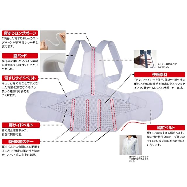 1本通った背すじ28cmのロングボーンが背中をしっかりと支えます。背筋サイドベルトをキュッと締めることで丸くなった背筋を無理なく伸ばし、美しく健康的な姿勢をつくります。