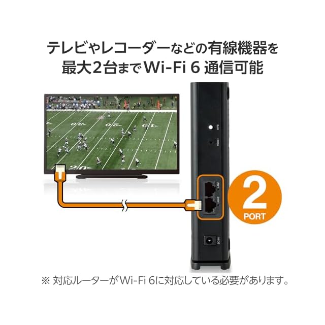 イーサネットコンバーターとしても使えるため、別売りのEasyMesh対応ルーターと繋げることで、テレビやレコーダーなどの無線機能をもたない有線機器もWi-Fi 6通信が可能になります(最大2台)。※EasyMesh対応ルーター(別売り)は、Wi-Fi 6に対応している必要があります。