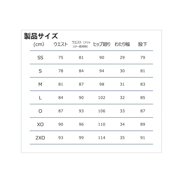 展開全サイズチャート:SSサイズ:ウエスト68-72cm、身長157-162cm、Sサイズ:ウエスト72-76cm、身長162-167cm、Mサイズ:ウエスト76-80cm、身長167-172cm、Lサイズ:ウエスト80-84cm、身長172-177cm、Oサイズ:ウエスト84-88cm、身長177-182cm、XOサイズ:ウエスト88-92cm、身長182-187cm、2XOサイズ:ウエスト92-96cm、身長187-192cm