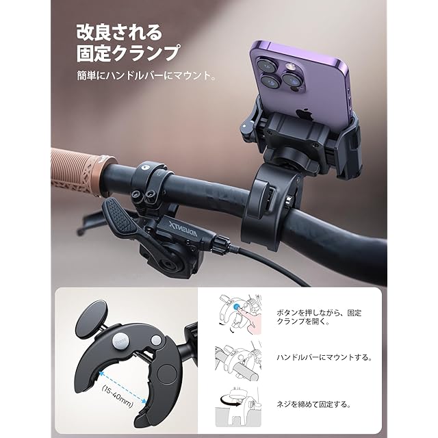 <p>2023新版 Lamicall クイック取付 自転車 スマホ ホルダー: 自転車 携帯ホルダー, スマホ自転車ホルダー, ロードバイク スマホホルダー スタンド, クロスバイク用 携帯置き , サイクリング フォルダー, iphone bike mount, スクーター用 スマホほるだー, 落下防止, 360度回転, 防振, 振動吸収, 簡単取付, モバイルホルダー, けいたい バーマウント, アイフォン, エクスぺリア, iPhone 2024, iPhone 16 16Plus 16Pro 16Pro Max, iPhone 15 15Plus 15Pro 15Pro Max, iPhone 14, 14Plus, 14pro, 14pro max, iphone 13 13 pro max 13 mini, 12 mini 11 Pro Max, 11 プロ マックス XS Max XR X 8 plus 7 7plus 6 6s 6plus se2, Samsung Galaxy S21, Xperia, android に対応 - 黒</P> <p><b>【簡単にスマホを取り付け・外し】</b><br>本製品はホルダーの横幅を調整して、スマホを固定します。同じスマホをご使用する場合は、一回設置しておけば、スマホの取り付け・外しは速いです。スマホをホルダーに入れ、ホルダー右側のロックレバーを回転して、スマホの幅より約3-4mm大きく調節して、ロックをかける。スマをガッチリ着装できます。</P> <p><b>【カメラに影響なし】</b><br>ホルダーはスマホの下半分だけを包みます。しっかりと固定する同時に、スマホのカメラを邪魔しません。走行中も撮影を楽しむことができます。</P> <p><b>【対応機種&ハンドルバー】約4.7-7インチのスマホに対応。iPhone 2024, iPhone 16 16Plus 16Pro 16Pro Max, iPhone 15 15Plus 15Pro 15Pro Max, iPhone 14, 14pro, 14pro max, 14Plus, 13 13 Pro, 13 Pro Max, 13mini ,12 11 11 Pro, 11 Pro Max, 11 プロ マックス, XS XS Max XR X 8 7 7plus 6 6s 6plus, S3 S4 S5 S6 S7, Galaxy S7 S6, Note 6 5, LG, P20 P10 lite, Galaxy, Xiaomi Redmi Note 8 9 10 pro miniなど。スマホの厚さは15mmまで対応可能で、横幅は60mm-90mmに対応できます。購入する前にご端末に合うかどうか是非ご確認ください。ハンドル径は14-40mmに対応可能。</P> <p><b>【改良される固定マウント】</b><br>改良されるネジタイプの固定クランプは取り付けボタンが設置され、工具不要で取り付けるだけでなく、従来型よりも速く取り付けることができます。設置の利便性を大幅に向上させます。</P> <p><b>【高品質素材・高精度な仕上げ】</b><br>ABS樹脂製ボディー、EVA樹脂マットは耐久性に優れています。利用されないとき、自転車につけたままでも大丈夫。360度回転でき、スマホのグーグルマップでナビを使用しながらライドを楽しめます。ツーリング / デリバリー / 宅配 / 通勤 / 通学 / ウーバーイーツ様々なシーンで、Lamicall自転車スマホホルダーで色々な自転車の楽しみ方をしましょう!</P> 片手操作 自転車用 スマホ ホルダー スタンド ロードバイク ワンタッチ スマートフォンホルダー 自転車携帯ホルダー 自転車すまほホルダー クロスバイク用 携帯置き サイクリング フォルダー バイク用 スマホ固定 bike phone mount ケータイホルダー すまほほるだー オートバイ 落下防止 360度回転 振動吸収 振動防止 スクーター用 けいたい バーマウント アイフォン自転車ホルダー スマホ自転車ホルダー iPhone 16 15 14 13 12 11 X
