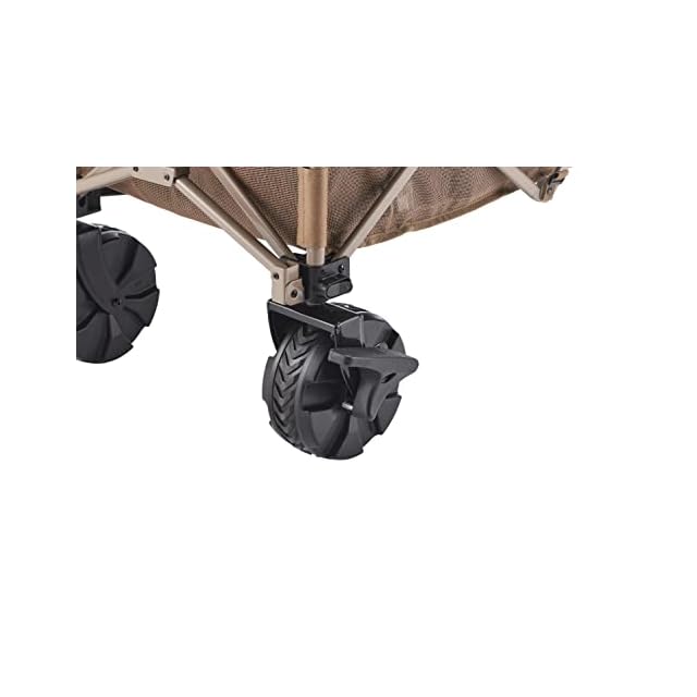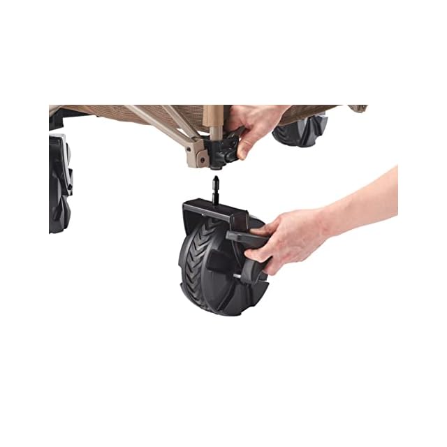 【ワイドタイヤ】通常のアウトドアワゴンよりも幅広のワイドタイヤを採用し、砂地や芝生、不整地などでもスムーズに移動できます。タイヤにはストッパーが付いており、坂道でもしっかり固定できるので安全です。また、ワンタッチで取り外し可能なので、荷台だけ車に積むことが可能です。