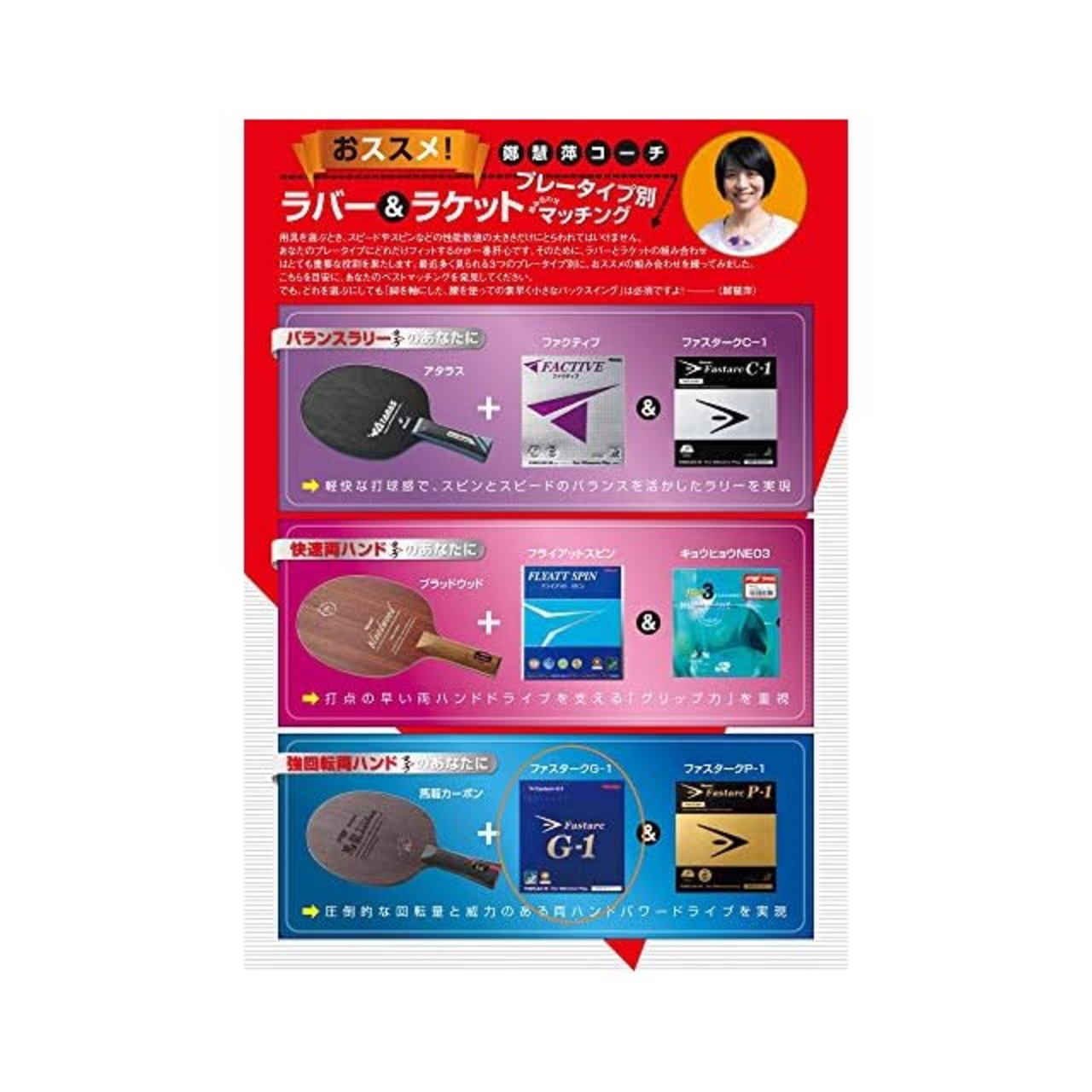 仕様:テンション系裏ソフトラバー、性能:スポンジ付(スピード/15.50、スピン/12.50)、スポンジ硬度:37.5(ドイツ基準/47.5)