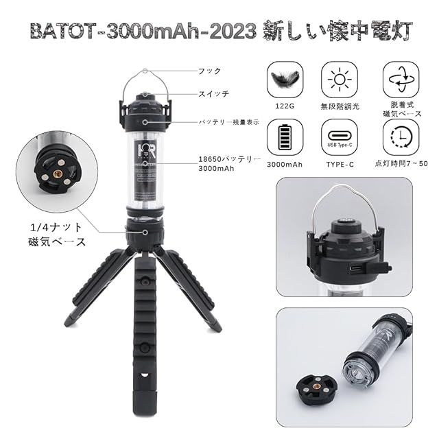 商品名:LED ランタン BATOT キャンプ ランタン 5つ点灯モード 3000mAH ランタン led 充電式 懐中電灯・無段階調光・IPX4防水防塵・磁石ベース・軽量 持ち運び便利・USB充電式 led キャンプ ライト アウトドア/ハイキング/探検/夜釣り/キャンプ/ハイキング/地震/災害/作業/停電/非常用照明/防災用