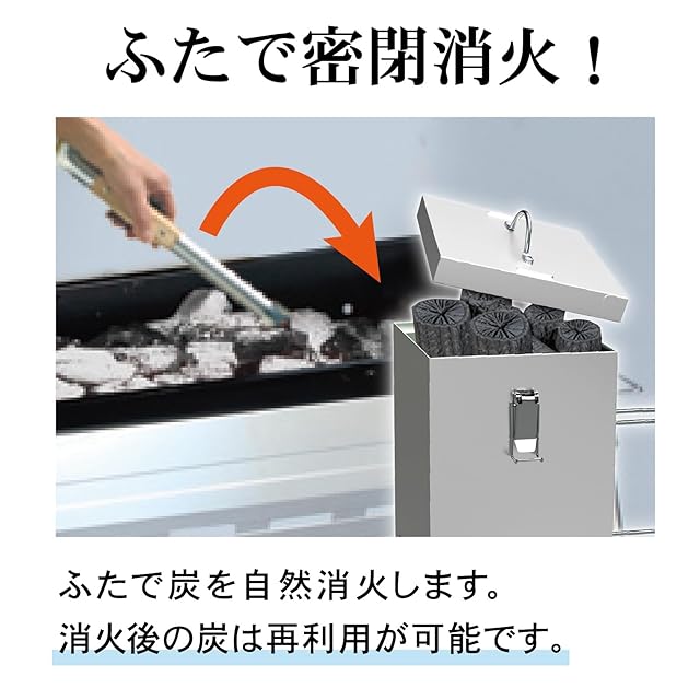 【ふたで密閉消火】ふたで炭を自然消火します。消火後の炭は再利用が可能です。