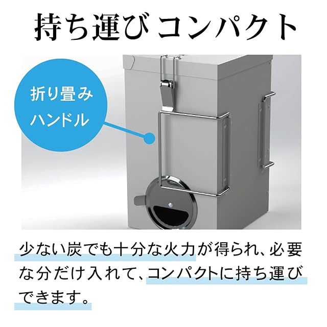 【コンパクトに持ち運べる】少ない炭でも十分な火力が得られ、必要な分だけ入れて持ち運ぶことができます。ハンドルは折りたたみ式です。