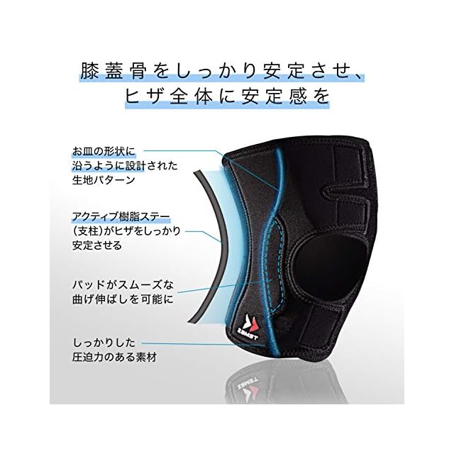 【動きを妨げずにしっかり安定】ヒザの曲げ伸ばしをしやすい独自のアクティブ樹脂ステーとお皿まわりのパッドが、ヒザをしっかり安定。