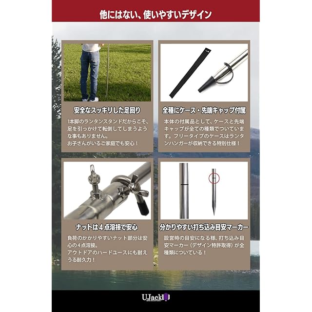 商品名:UJack(ユージャック) ランタンスタンド ハンマーランタンスタンド ステンレス製 打ち込み式 自立型 収納ケース付き (タイプ:ダブルフリー/ハンガー内部収納式)