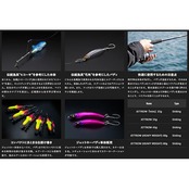 特徴:「逆向き羽(水の抵抗を受けて潜ろうとする向き)設計」「スタビライザー(頭部)」「ハリス (フロロ 24lb) , スナップ付き (専用の仕掛け巻きを付属)」
