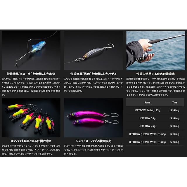 シリーズ:【ジェットロー (JETTROW) セット】/ モデル: 【60g】……シラスサイズのノーシンカーマイクロルアーをヘビーミノー並みに沖へ遠投させれるマイクロベイトパターンの救世主「ジェットロー」! さらなる飛距離を求めた、ど遠投モデル「60g/80g」。 10ft以上のロングロッドを使用し本気で飛距離を求めれば、最大100m超えを安定して出す。 「60g」は「ビヨンドゾーン M/MH」「ショアジギング M/MHクラス」 の竿がおすすめ!