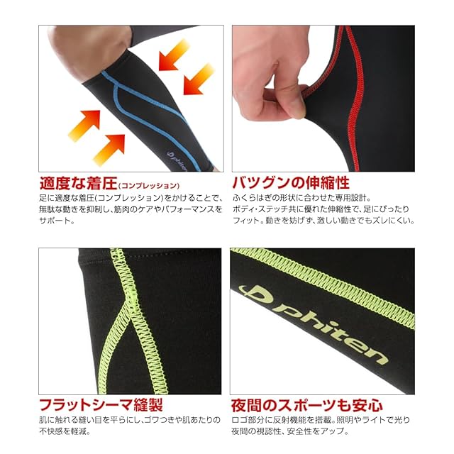 商品名:ファイテン(phiten) スポーツスリーブ X30 足用 2枚入 カーフスリーブ ふくらはぎサポーター メンズ レディース Lサイズ ブラック×グリーンイエロー ランニング マラソン バレーボール テニス バドミントン 【(公財)日本バドミントン協会審査合格品】