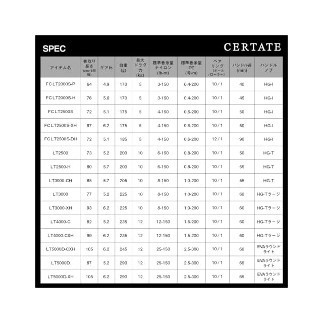 【標準糸巻量PE(号-m)】:0.6-200【標準糸巻量ナイロン(lb-m)】:4-150